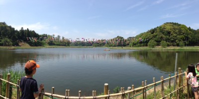 大きな池を跨いで大きな鯉のぼりが泳いでいる様は