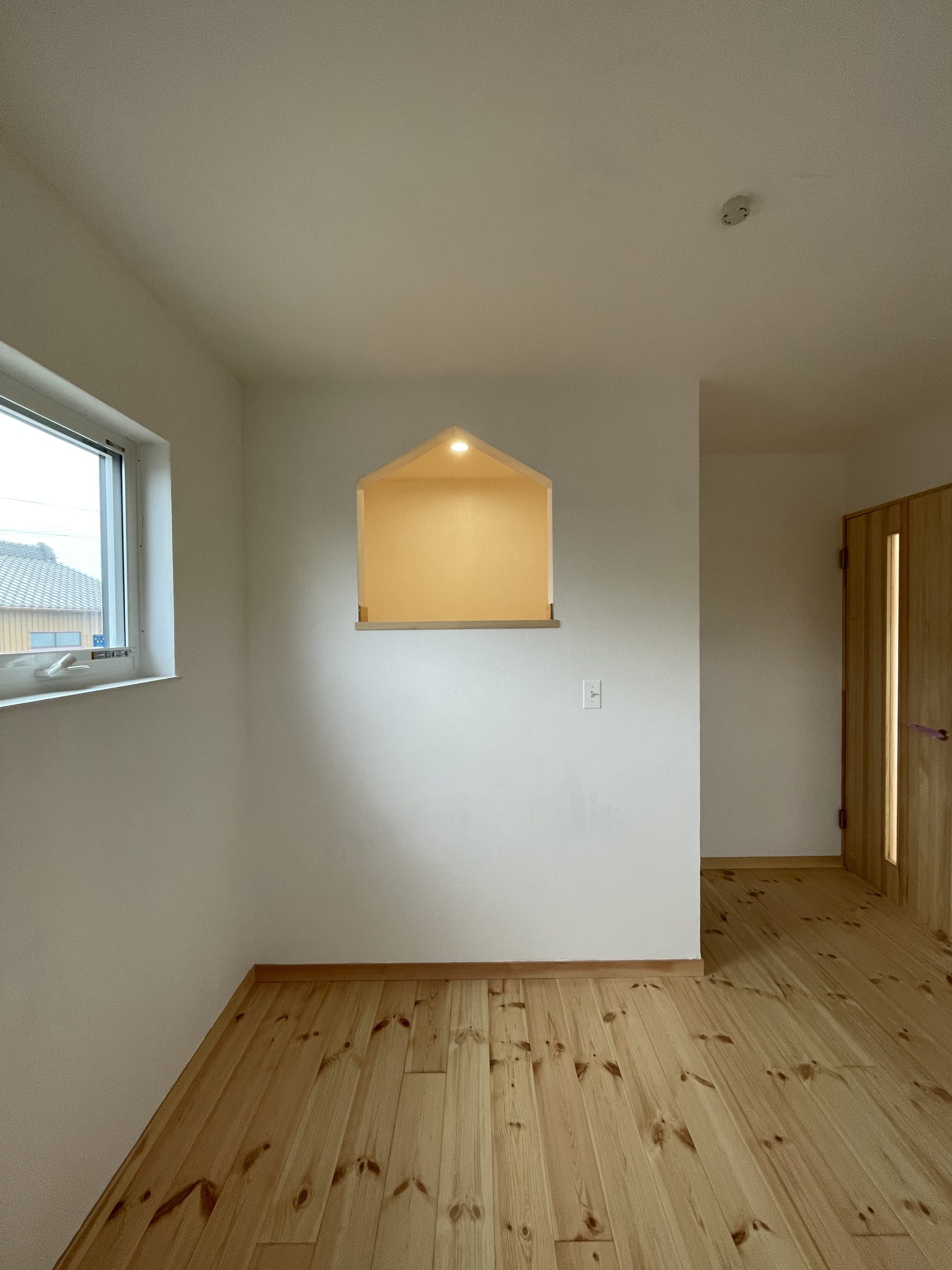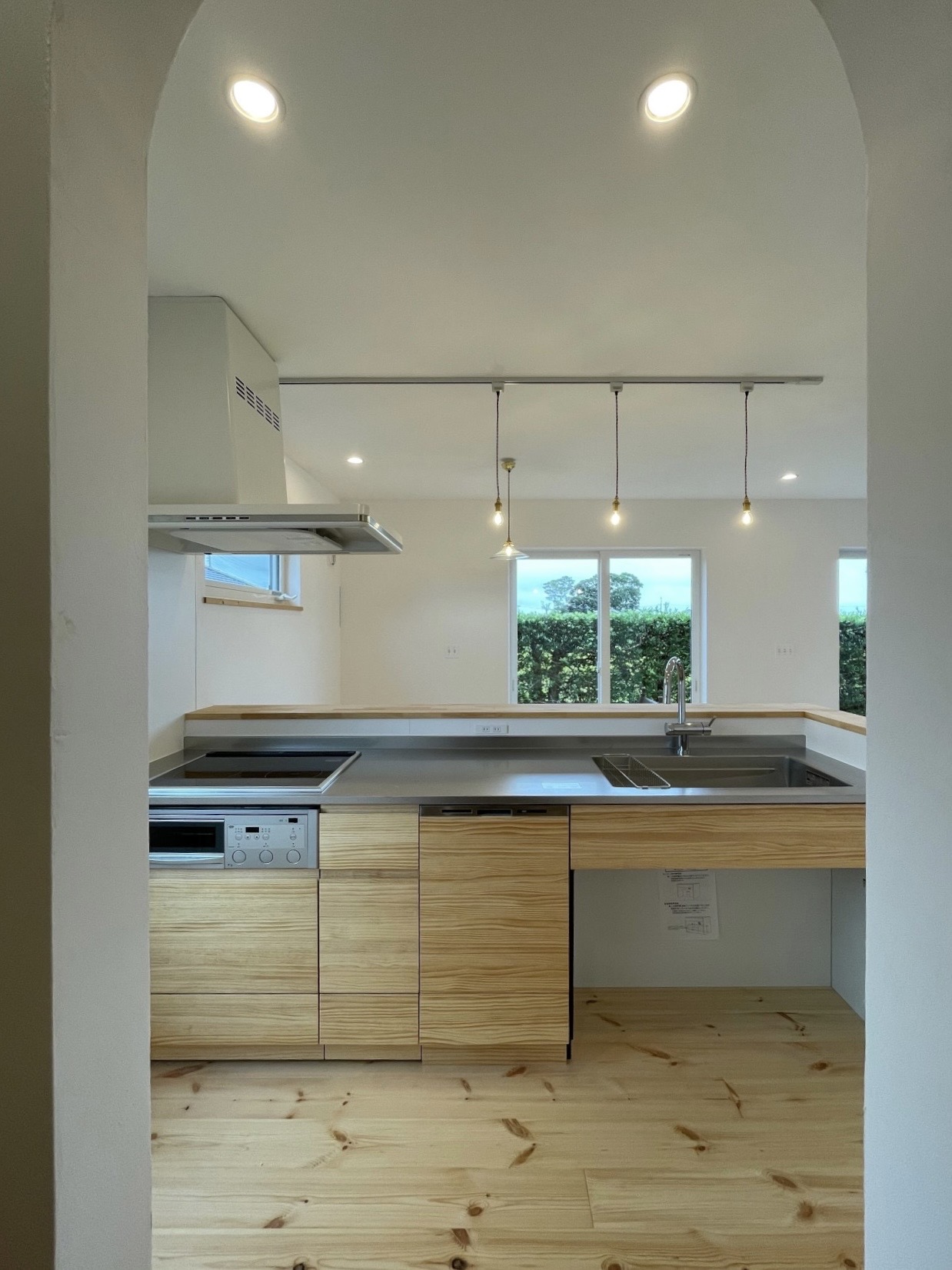 自然素材をふんだんに使ってシンプルで明るい家を作りたいというご要望から始まった家づくり。床、内装、ドア、照明、機器のほとんどをご自分たちで探して確かめて選ばれました。建物の形状にもこだわりを取り入れて遠くからでもひと目で分かるデザインの家が完成しました。